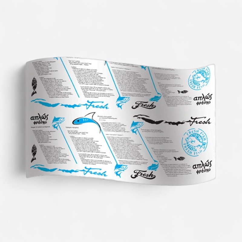Χαρτί Περιτυλίγματος Ιχθυοπωλείου. Το χαρτί περιτυλίγματος ιχθυοπωλείου είναι ένα ειδικό είδος χαρτιού που χρησιμοποιείται για την συσκευασία και την μεταφορά ψαριών και θαλασσινών. Είναι αντικολλητικό χαρτί με επικάλυψη από πλαστικό νάιλον στην εσωτερική πλευρά για να αποτρέπει την διαρροή των υγρών καθώς και τις οσμές. Ανθεκτικό στην υγρασία και στα λίπη, διατηρώντας την καθαριότητα και την φρεσκάδα του προϊόντος κατά την μεταφορά.