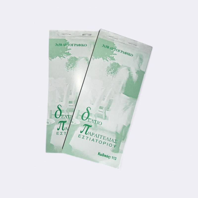 Δελτίο Παραγγελίας Τριπλότυπο. Τα μπλοκάκια παραγγελίας τριπλότυπα είναι έντυπα που χρησιμοποιούνται κυρίως σε εστιατόρια, καφετέριες και άλλες επιχειρήσεις εστίασης για την καταγραφή παραγγελιών. Αποτελούνται από τρία αντίγραφα ανά σελίδα (πρωτότυπο και δύο αντίγραφα), ώστε να μπορούν να δίνονται αντίγραφα στον σερβιτόρο, στην κουζίνα και στο ταμείο. Είναι δεμένα με καρμπόν και το κάθε μπλοκ περιλαμβάνει 50 φύλλα.