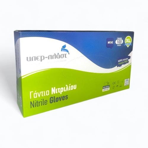 Γάντια νιτριλίου μίας χρήσης μπλε XL χωρίς πούδρα. Τα γάντια nitrile προσφέρουν προστασία, ελαστικότητα αλλά και άνεση σε πολύωρη χρήση, είναι αντιαλλεργικά, ενώ δεν περιέχουν πούδρα και λάτεξ. Xαρακτηρίζονται από την ιδιαίτερη ανθεκτικότητα τους σε τρυπήματα και σχισίματα καθώς και, από την αυξημένη προστασία που προσφέρουν έναντι σε χημικά και λάδια. Επιπλέον, προσφέρουν πολύ καλή αίσθηση αφής. Προτείνονται για εφαρμογές όπου απαιτείται αυξημένη προστασία από τρυπήματα, σε χώρους εστίασης και μονάδες παραγωγής και επεξεργασίας τροφίμων, σε υπηρεσίες καλλωπισμού (τατούαζ, περιποίηση νυχιών, κομμωτήρια), καθώς επίσης και σε βιομηχανίες χημικών, σε εργασίες που απαιτείται προστασία από λάδια, σε συνεργεία. Πιστοποιημένο προϊόν για επαφή με τρόφιμα. Διαθέσιμο σε διάφορα μεγέθη.