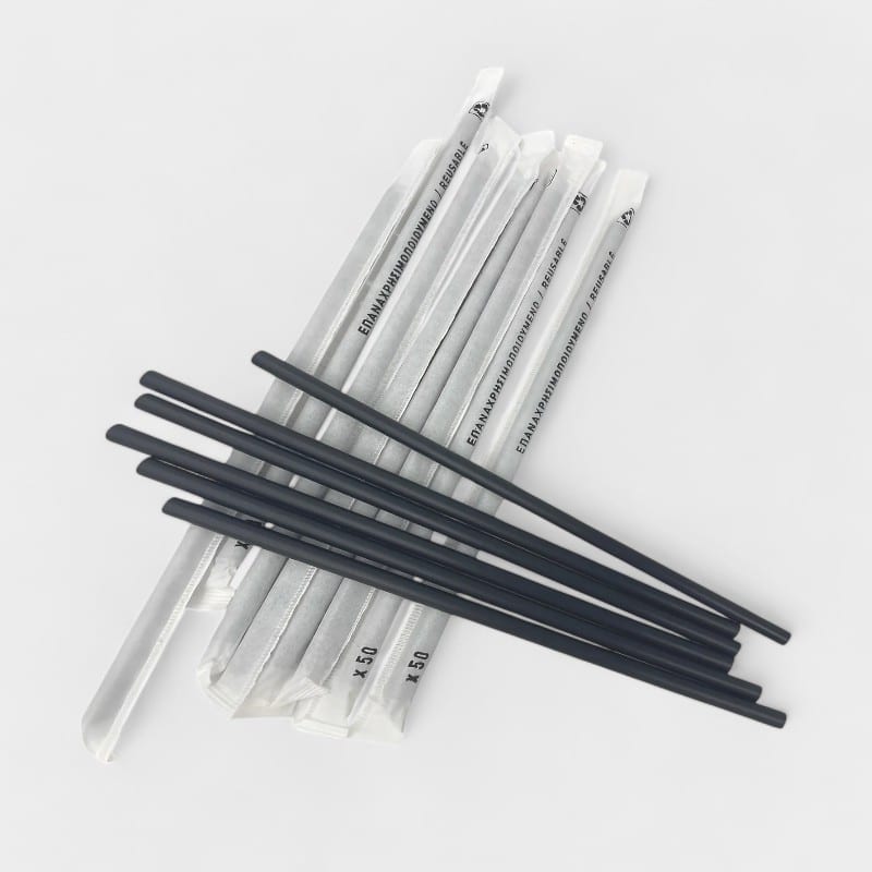Καλαμάκια Πλαστικά Επαναχρησιμοποιούμενα Για Freddo 180mmX4mm σε Μαύρο Χρώμα . Τα πλαστικά επαναχρησιμοποιούμενα καλαμάκια είναι κατασκευασμένα από ανθεκτικό υλικό, ιδανικά για πολλαπλές χρήσεις μειώνοντας τα πλαστικά απορρίματα. Είναι συσκευασμένα 1/1 και μπορούν να πλυθούν έως και 50 φορές.