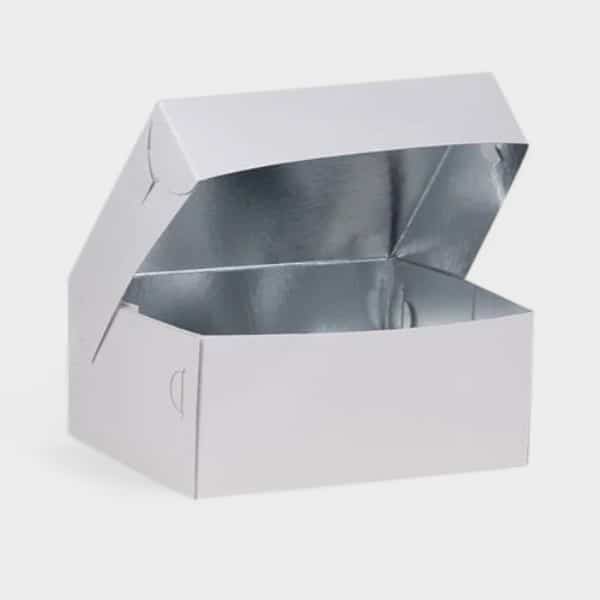 Χάρτινο Κουτί Ζαχαροπλαστείου Λευκό Με Αδιάβροχη Εσωτερική Επένδυση Αλουμινίου. Ιδανικό για μεταφορά και αποθήκευση σε γλυκά, πάστες, κουλούρια κ.α. Η εσωτερική επένδυση από αλουμίνιο εξασφαλίζει τη διατήρηση της φρεσκάδας και προστατεύει το περιεχόμενο από υγρασία και αλλοιώσεις. Πιστοποιημένο προϊόν για επαφή με τρόφιμα. Διαθέσιμα σε διάφορα μεγέθη.
