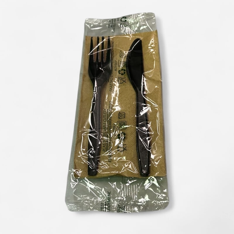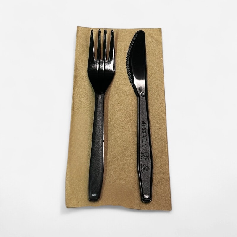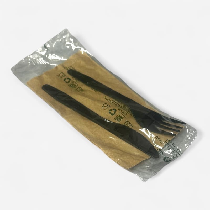 Πλαστικό Κουβέρ Μαύρο με Χαρτοπετσέτα Eco-Kraft 33×33. Έτοιμο σετ που περιλαμβάνει πλαστικό μαύρο μαχαιροπίρουνο και οικολογική χαρτοπετσέτα διαστάσεων 33×33 σε καφέ χρώμα. Είναι συσκευασμένο ατομικά για μεγαλύτερη ευκολία και ασφάλεια. Κατάλληλο για χρήση σε εστιατόρια, take away, catering, delivery κλπ. Ιδανικό για κρύα και ζεστά γεύματα.
