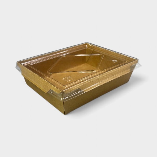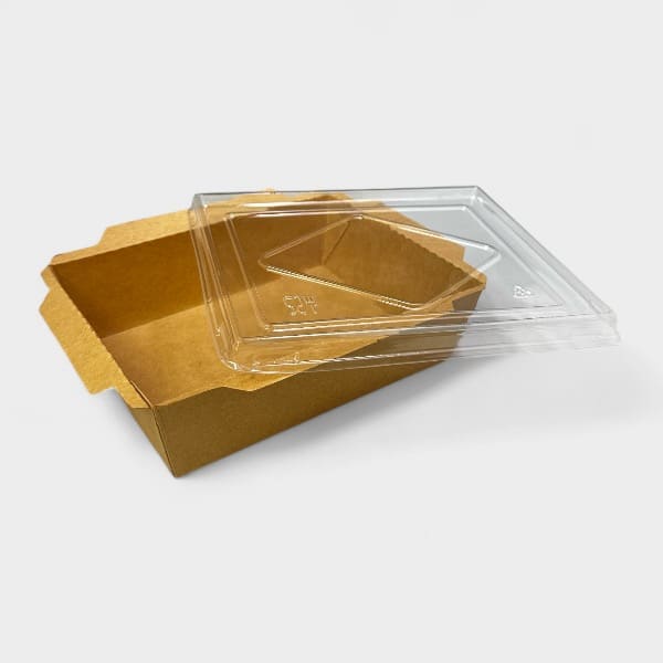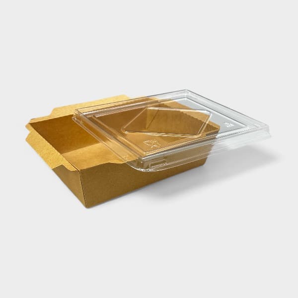 Κουτί Φαγητού Kraft Καφέ με Καπάκι PET. Κατάλληλο για φούρνο μικροκυμάτων. Το κουτί φαγητού Kraft καφέ με καπάκι PET είναι ένα πρακτικό και οικολογικό δοχείο συσκευασίας φαγητού, φτιαγμένο από ανθεκτικό ανακυκλώσιμο χαρτί Kraft. Το καπάκι PET (πολυαιθυλένιο υψηλής πυκνότητας) είναι διαφανές, επιτρέποντας την εύκολη προβολή του περιεχομένου, ενώ προσφέρει ασφαλές κλείσιμο για διατήρηση της φρεσκάδας και αποφυγή διαρροών. Είναι ιδανικό για take away ή delivery φαγητού, κατάλληλο για σαλάτες, σάντουιτς και διάφορα γεύματα. Πιστοποιημένο προϊόν για επαφή με τρόφιμα.