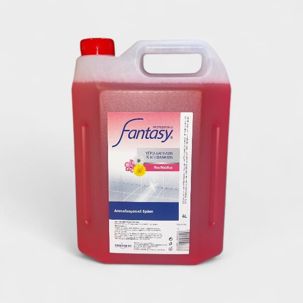 Υγρό καθαριστικό γενικής χρήσης με αλκοόλη και άρωμα λουλούδια 4lt. Eίναι ένα γενικό καθαριστικό για τις περισσότερες επιφάνειες ακόμα και ευαίσθητες(όπως μάρμαρα, πλακάκια, μωσαϊκά) που αφήνει ένα δίχτυ καθαριότητας και λάμψης και ταυτόχρονα προσφέρει οικονομία στην κατανάλωση και τη χρήση. Κατάλληλο για επαγγελματική χρήση, σε δάπεδα, τοίχους, γραφεία, είδη υγιεινής, είναι ασφαλές και δεν ερεθίζει το δέρμα. Αφήνει απαλό άρωμα φρεσκάδας λουλουδιών. Δοσολογία 50-100 ml ανά 10 λίτρα νερού.